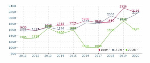Wie fast überall in Deutschland sind die Immobilienpreise in Erkelenz deutlich gestiegen. Im Durchschnitt um ca. 50 %. Lag der durchschnittliche Kaufpreis für eine 60 m2 Wohnung im Jahre 2011 noch bei 1.168,28 pro m², liegt er im Jahr 2021 bereits bei 2.683,92 pro m². Tendenz steigend!