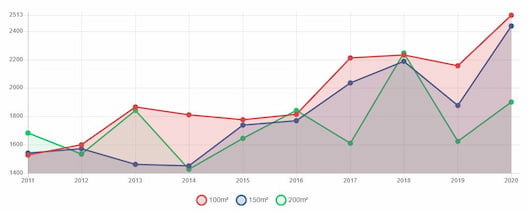 Wie fast überall in Deutschland steigen auch die Immobilienpreise in Wegberg immer weiter an. Lag der durchschnittliche Kaufpreis für eine 100 m2 Wohnung im Jahre 2011 noch bei 1.049,58 pro m², liegt er im Jahr 2021 bereits bei 2.062,13 pro m².